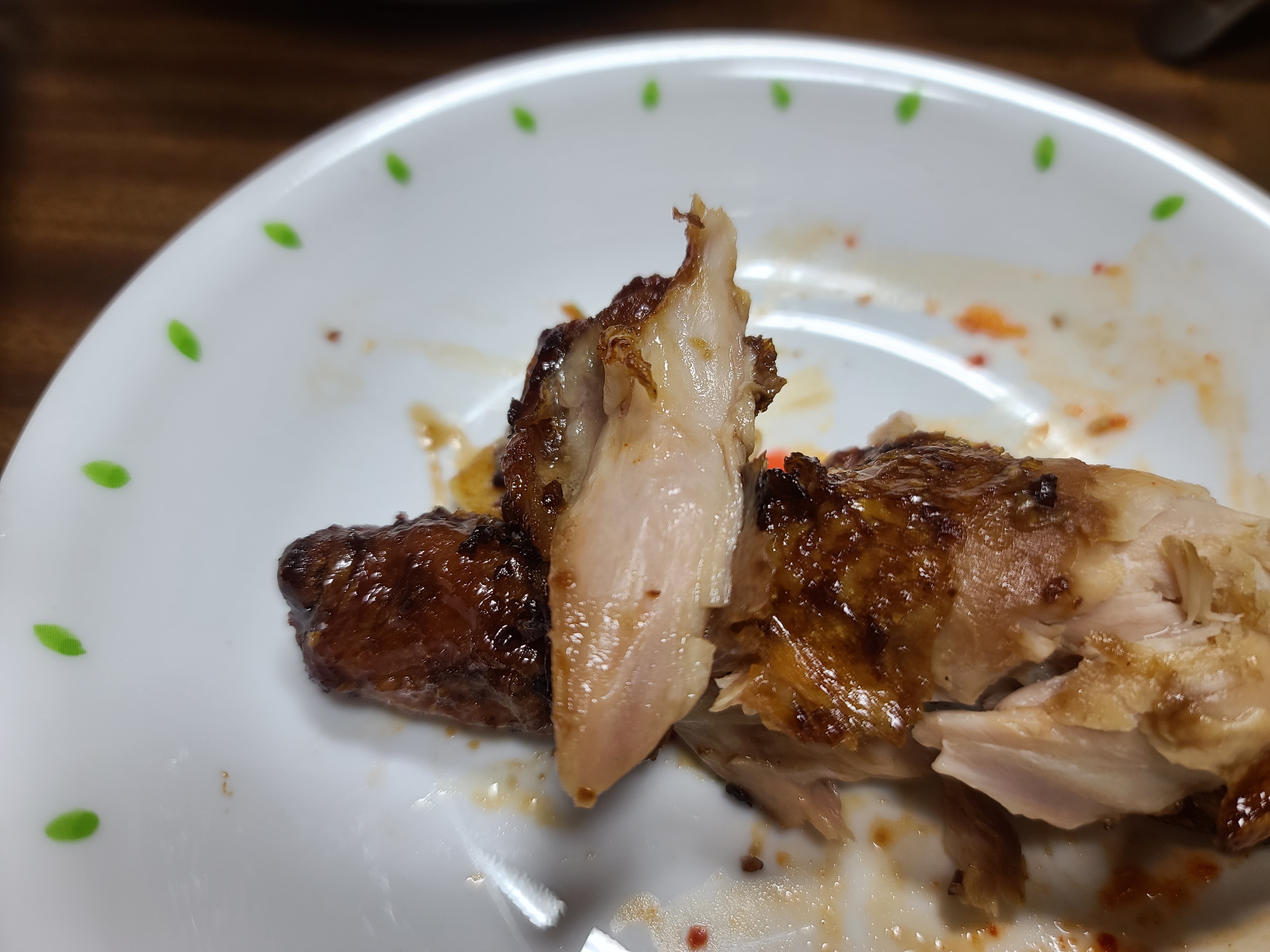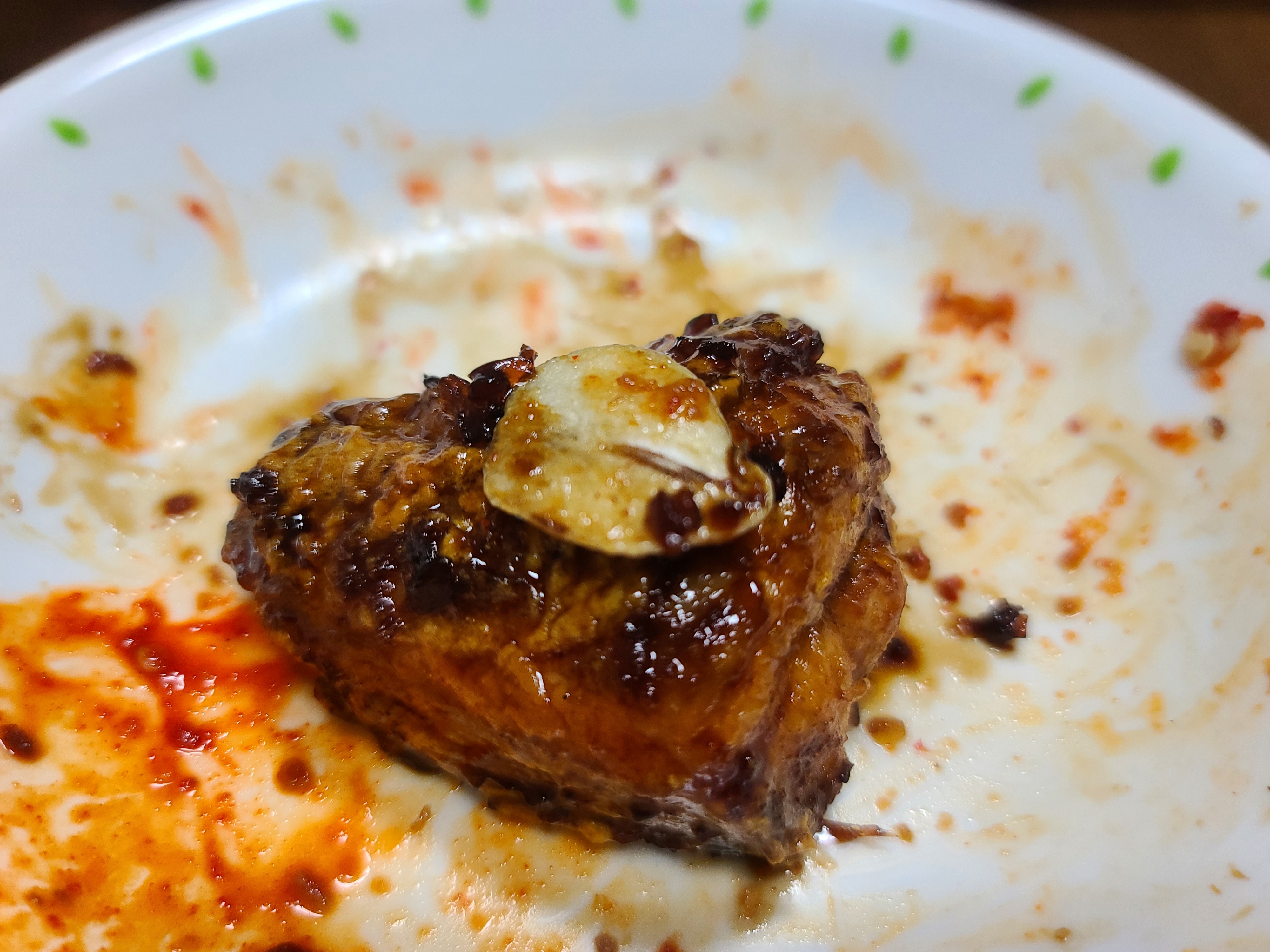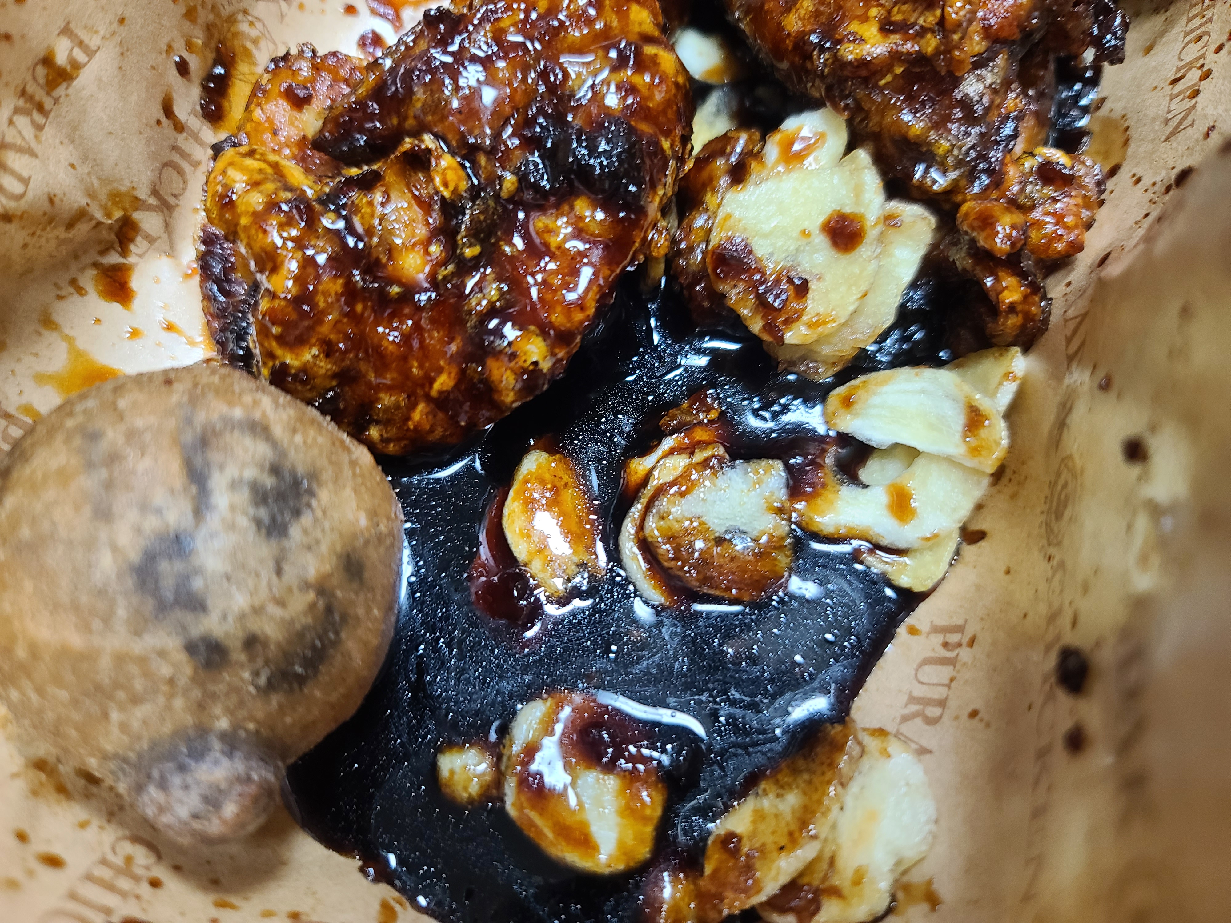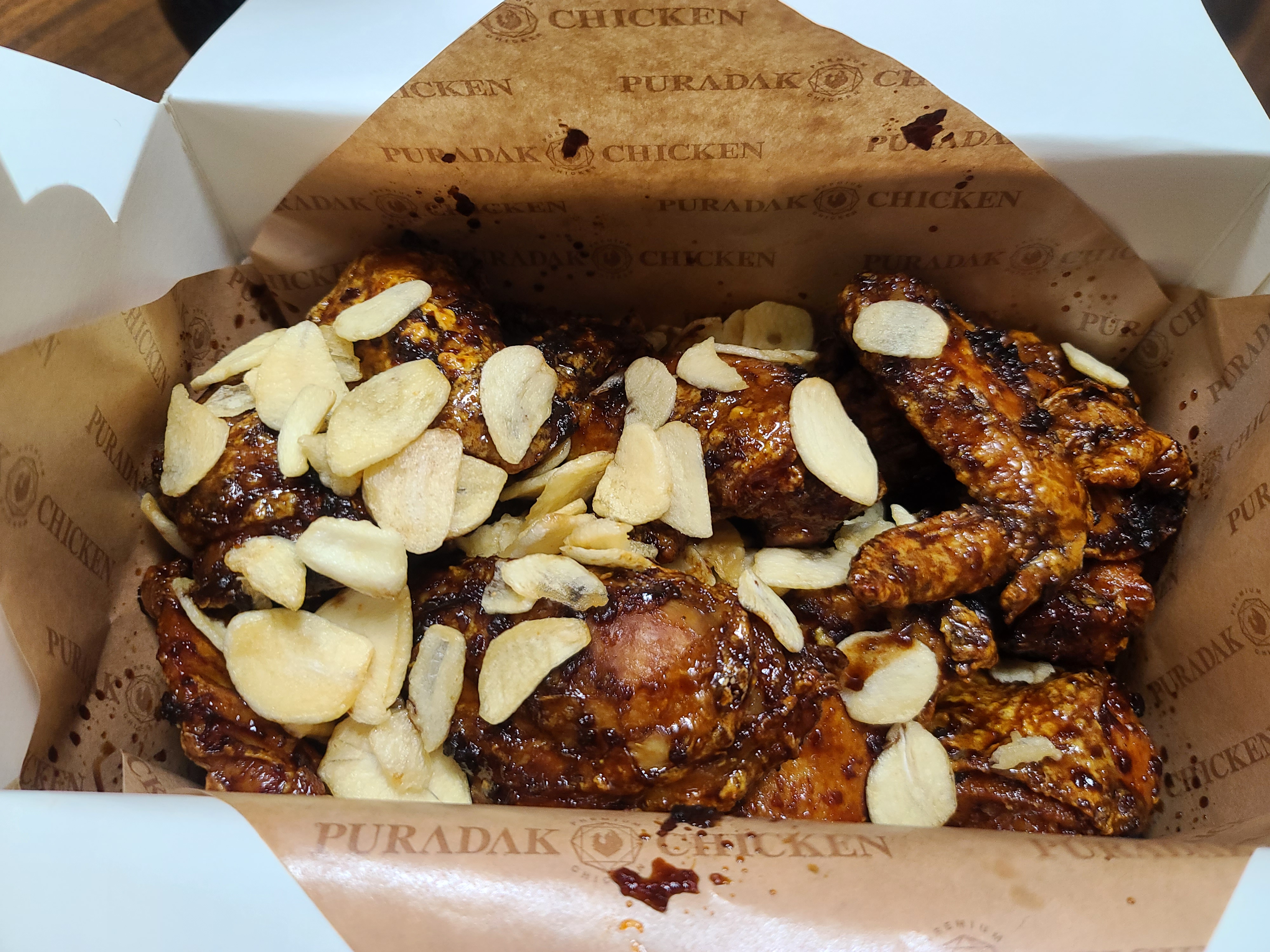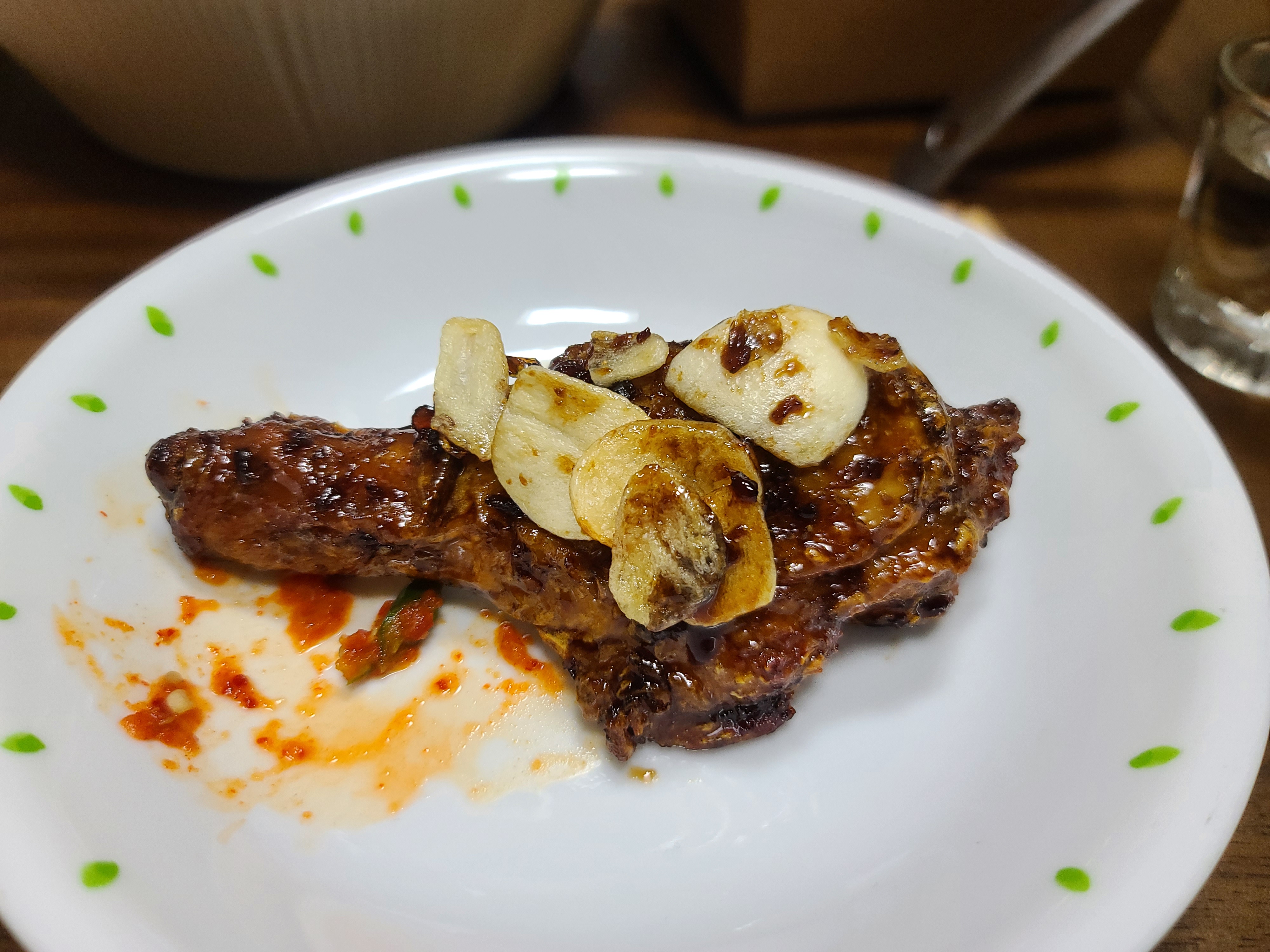 닭다리에 튀긴 마늘칩 올려서 먹는 맛