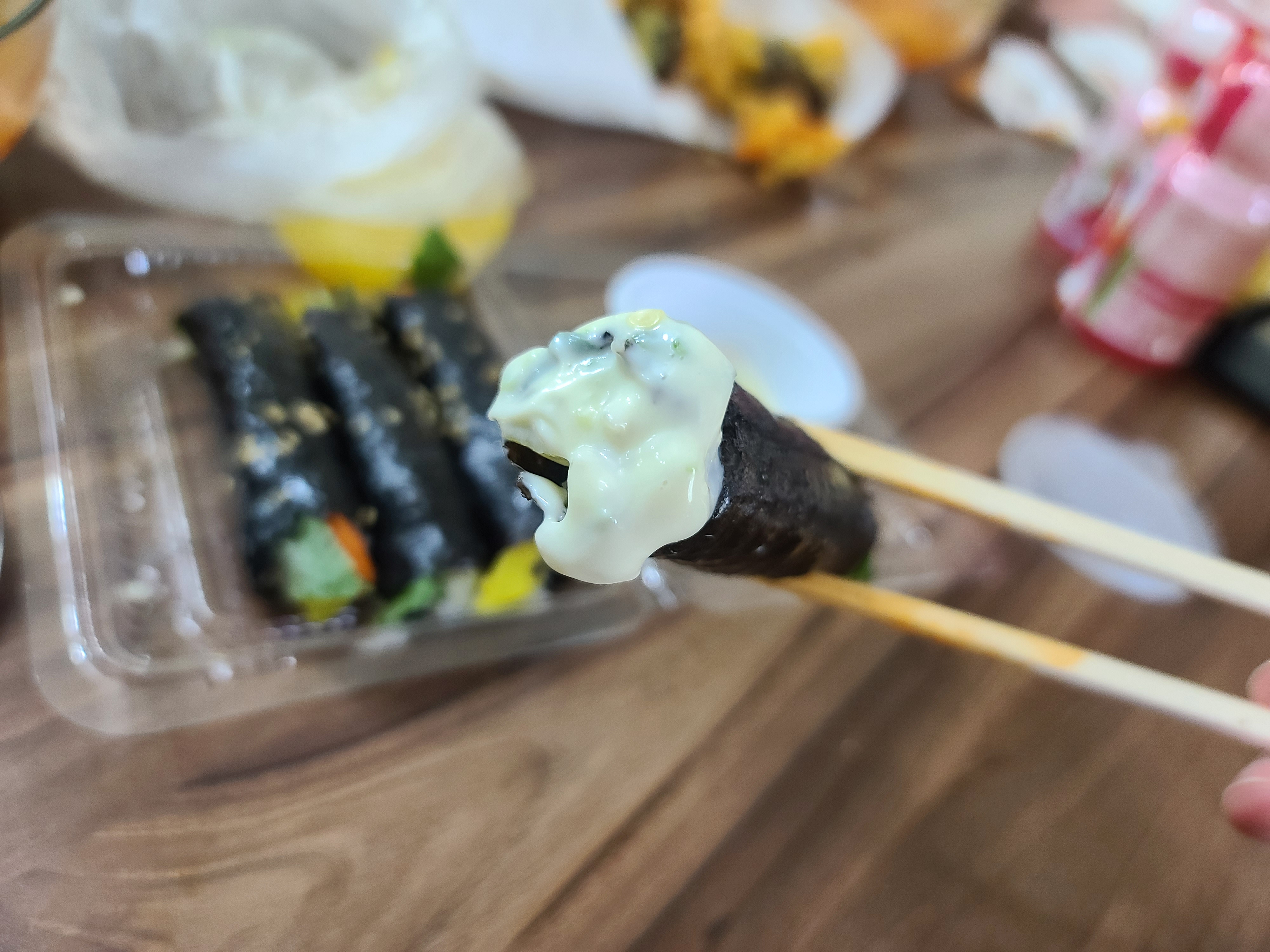 마요네즈에 찍어먹으면 참치마요네즈 김밥의 맛이 납니다.