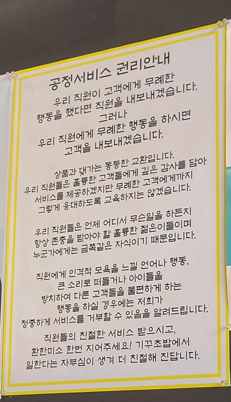매장에 적혀 있었던 공정 서비스 권리 안내문입니다.