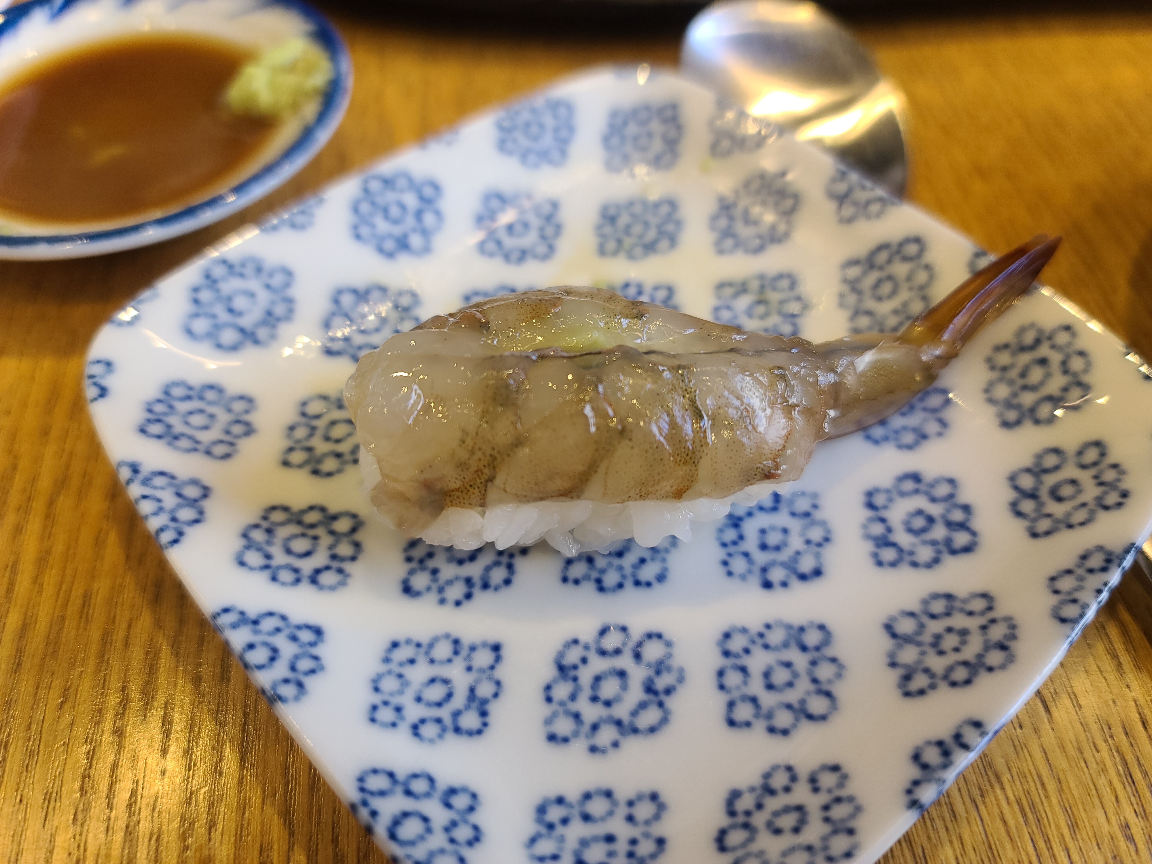생새우 초밥과 뱃살 쪽 기름진 연어 초밥입니다.