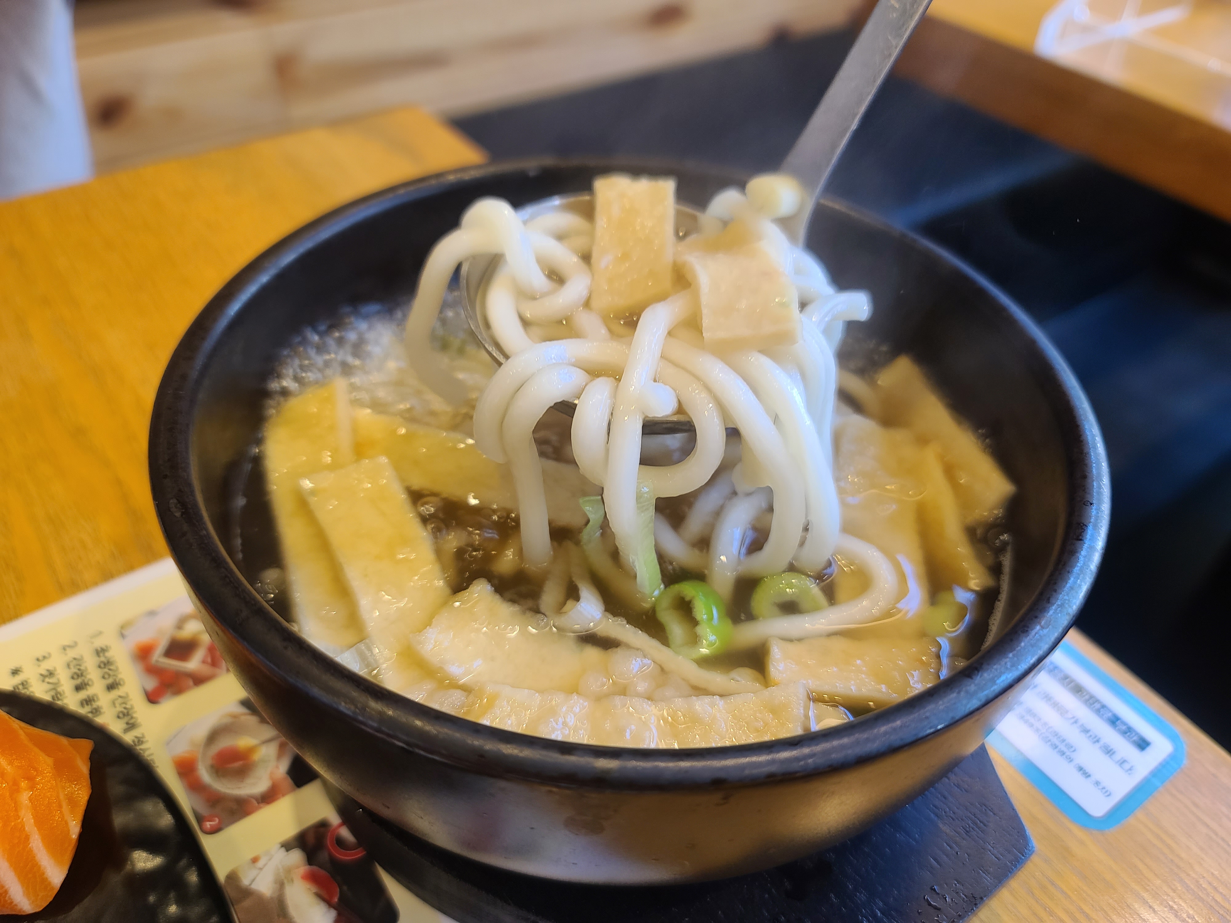 이 우동은 무한리필입니다. 정말 맛있는데 배가 불러서 리필한 적은 없습니다.