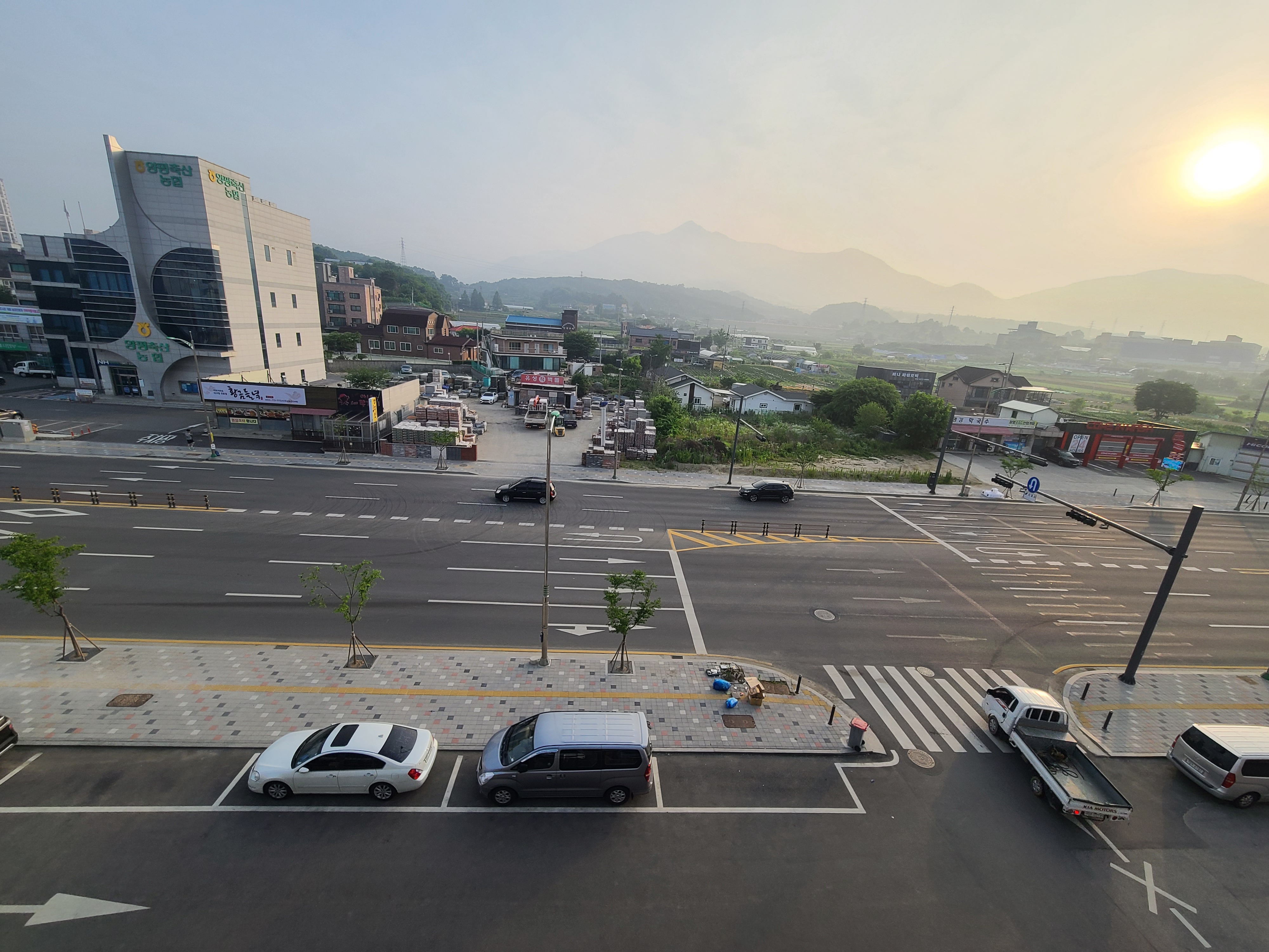 아침의 헬스장에서의 뷰는 저 멀리 백운봉이 살짝 보이고~ 주차장도 더 깨끗하게 잘 보입니다.
